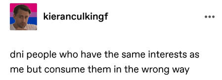 if you're homophobic, racist, antisemitic, islamophic etc.if you're a terf (!!)if you're under the age 14 or over age 25 (unless i followed you first)if you think fiction doesn't effect real life